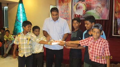 On Thursday evening at 7.00 pm the Evening Study Classes had their Christmas Party organized by Fr. Edwin Colaco and the boarders with the assistance of Bro. Roshan. There were lots of fun games and party games which the children and youngsters thoroughly enjoyed. They had bombing the city, Electric Wire, Form groups in numbers etc. Fr. Edwin Colaco said a few words to wish all a very Merry Christmas and a Happy New Year and told the children that Jesus came to teach us to be good to others and reach out to help one and other. Once again the boarding choir that had been trained by Sir Haydn Dias sang for the children and the band that was conducted by Mr. Furtado played a coupe of Christmas Carols to put everyone in the mood for Christmas. The boarders were also present helping in the games and programme. The Surprise item was Santa who came in at the end of the program and threw a couple of sweets and also left a message of Love and Peace. The children then went to their classroom where each one was given a Christmas packet to take home. The hall was well decorated with Christmas banners.